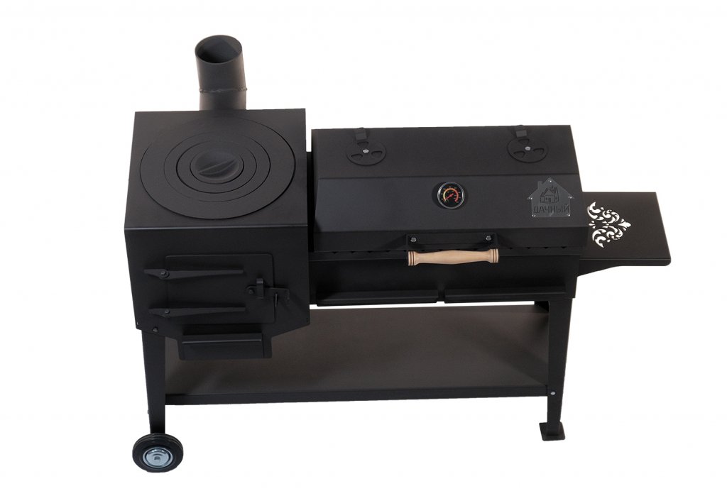Специальная ручка для транспортировки, а также колеса позволяют легко переместить Казан-гриль по загородному участку. Конструкция ножек оснащена специальными упорами, что делает ее устойчивой на любой поверхности. Отличительной особенностью казан-гриля "Дачный" является объединение печи под казан и гриля. С одной стороны, это устройство можно использовать для приготовления блюд в казане, с другой - на гриле, либо делать это одновременно. Это обстоятельство позволяет готовить пищу на большую компанию в очень короткий промежуток времени.